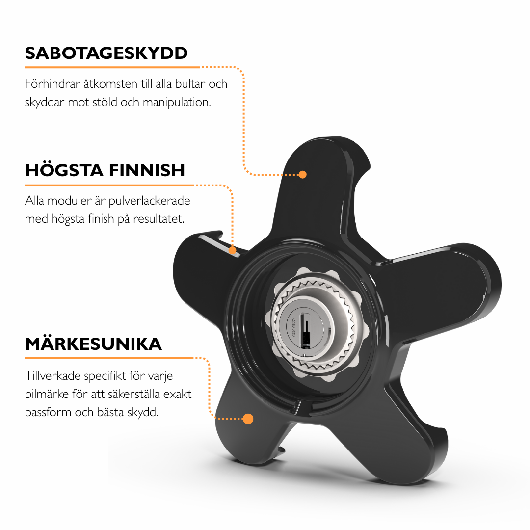 Vårt originallås har fem armar som effektivt förhindrar åtkomst till hjulbultarna. Modulen plomberas sedan med vår högsäkerhetscylinder från ASSA ABLOY. För dig som vill att ditt stöldskydd skall synas. Tack vare sin unika konstruktion tillför även Rimgard Original ett extra lager skydd mot sabotage. Passar de flesta OEM fälgar.