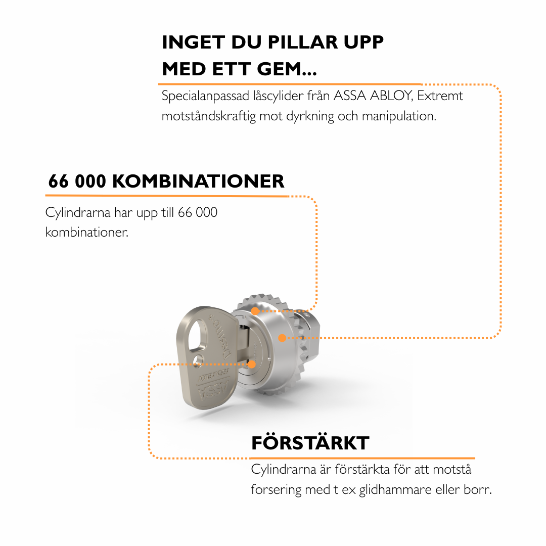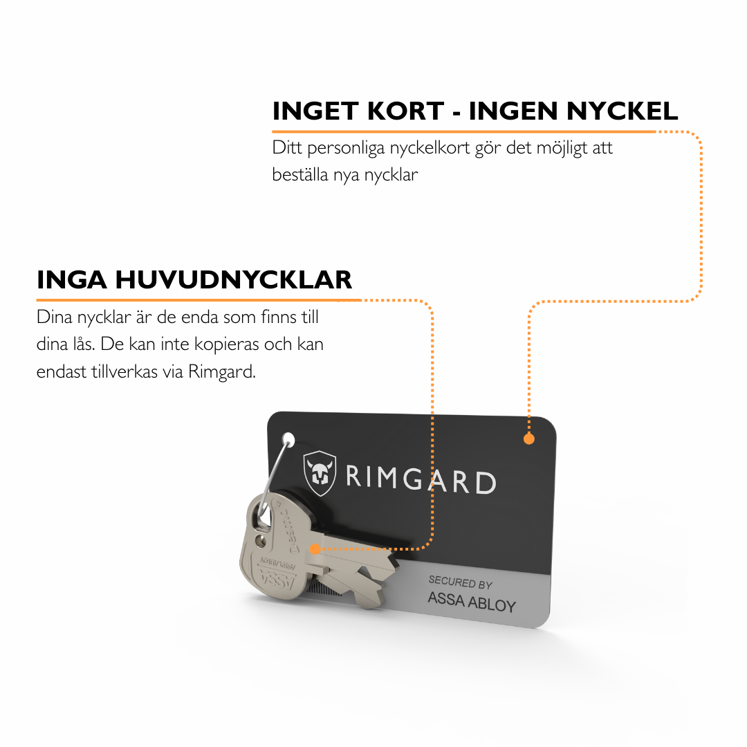 - Två nycklar och ett nyckelkort. Detta är de enda nycklarna som finns till dina lås, det finns heller inte någon huvudnyckel. Tappa inte bort dessa, nya nycklar kan endast beställas mot uppvisande av nyckelkortet.